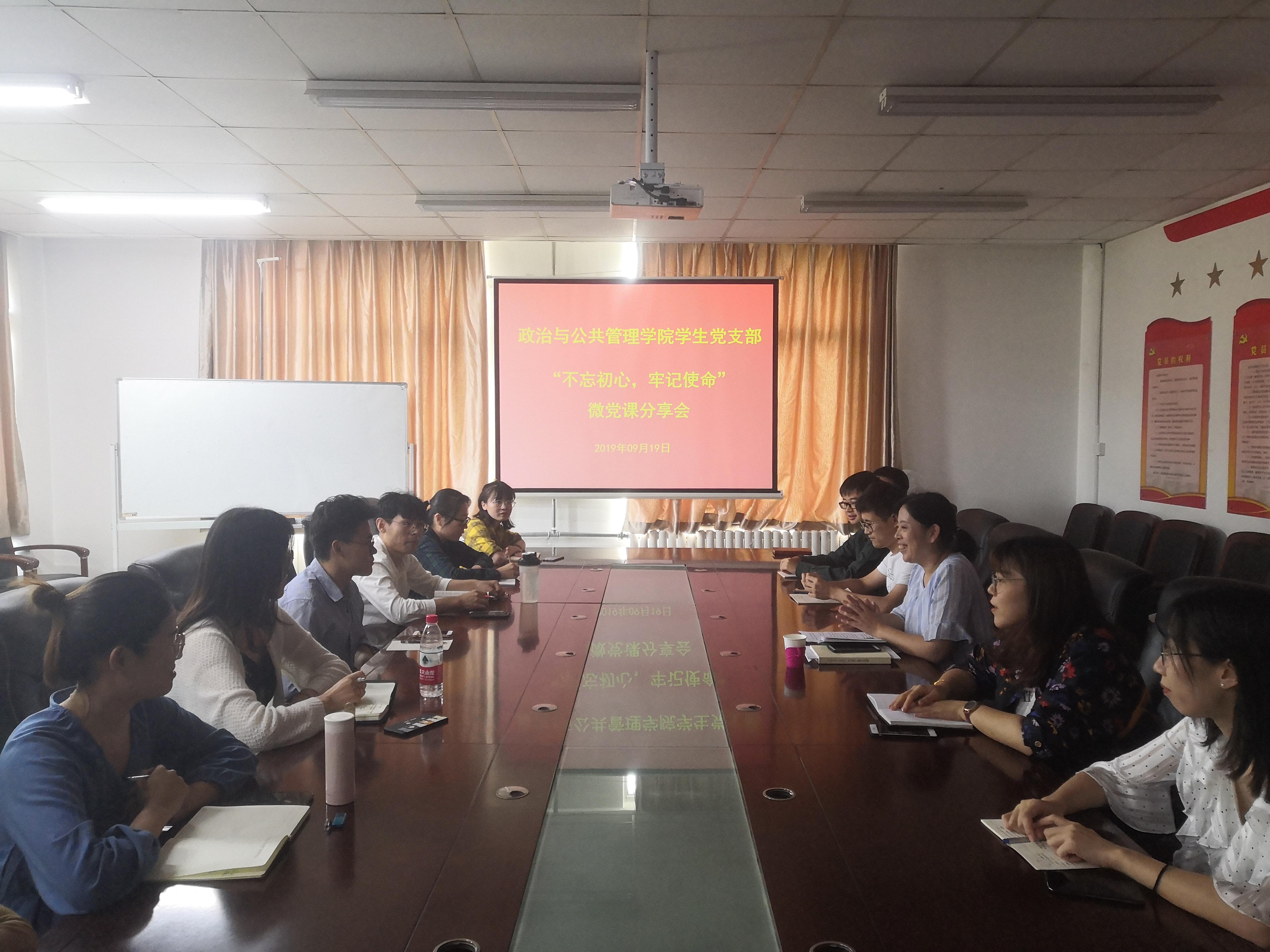 随后,学生党员赵雪瑶、李一分别从国家和个人两个层面进行微党课的展示与分享。赵雪瑶分享的题目为《光辉的历程,伟大的奇迹——中华人民共和国成立70周年》,李一分享题目为《“守初心、重担当、做表率”——学张富清先进事迹,做向上向善“政管人》。微党课展示之后,学生党员们积极分享了自己对于“不忘初心、牢记使命”这一主题的理解和感悟,并表示在日后的学习、工作、生活中,要牢记自己的初心和使命,时刻以党员的标准严格要求自己。