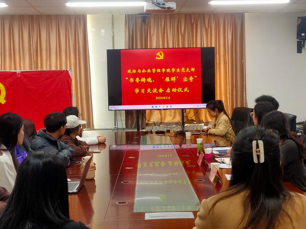 学生党支部于二号实验楼406开展“书香铸魂,‘雁群’出奇”学习交流会启动仪式暨第一期深入学习贯彻习近平文化思想。本次活动由党员代表张晴主持、李雨桐主讲,学生第一党支部书记张伟及全体学生党员参加。