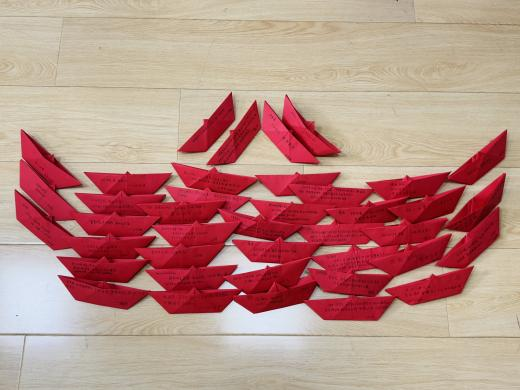 毕业生党员们将红纸折叠成“红船”,并在上面写下对未来的庄重承诺及对新生的寄语。承载承诺与期望的 “红船”将时刻提醒毕业生党员牢记入党初心,在人生新征程中把稳方向、奋勇前行。