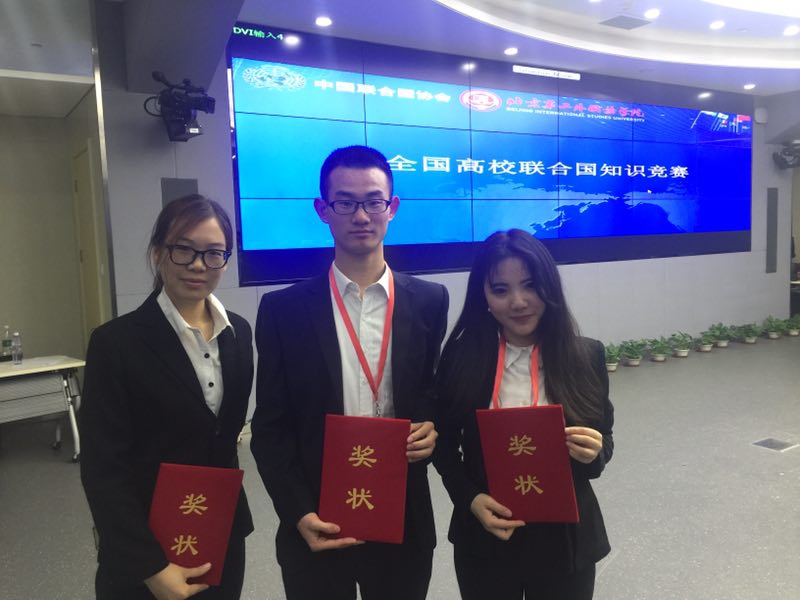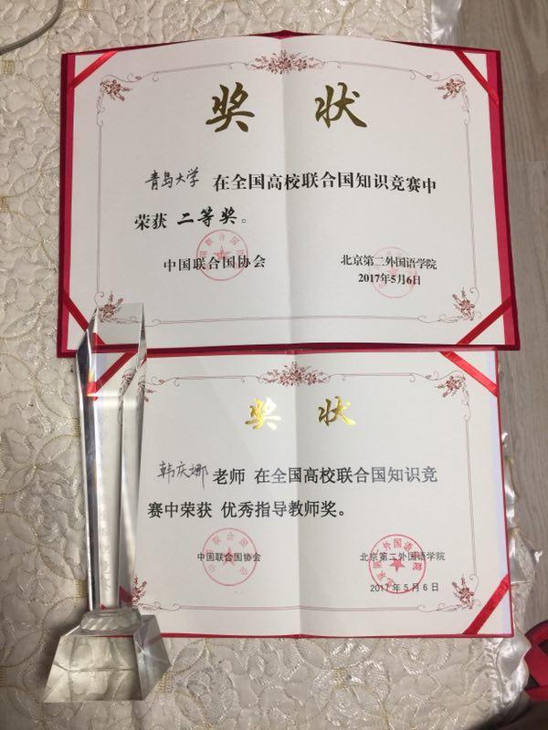 学生过关斩将,以小组第一名的成绩挺进决赛,最终获得首届全国高校联合国知识竞赛二等奖,韩庆娜荣获优秀指导教师奖,为学校争得了荣誉。
