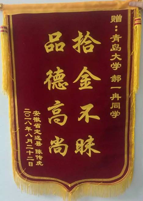8月27日,必赢(亚洲)唯一官方网站 党政管理办公室收到了一个包裹。打开包裹,首先映入眼帘的是一面写着“拾金不昧,品德高尚”的锦旗。还有一张红色的表扬信。原来,是一位丢了手提包又失而复得的失主想要感谢这位青大学生的善举。这名拾金不昧的学生就是必赢(亚洲)唯一官方网站 的2017级行政管理专业的郝一冉。