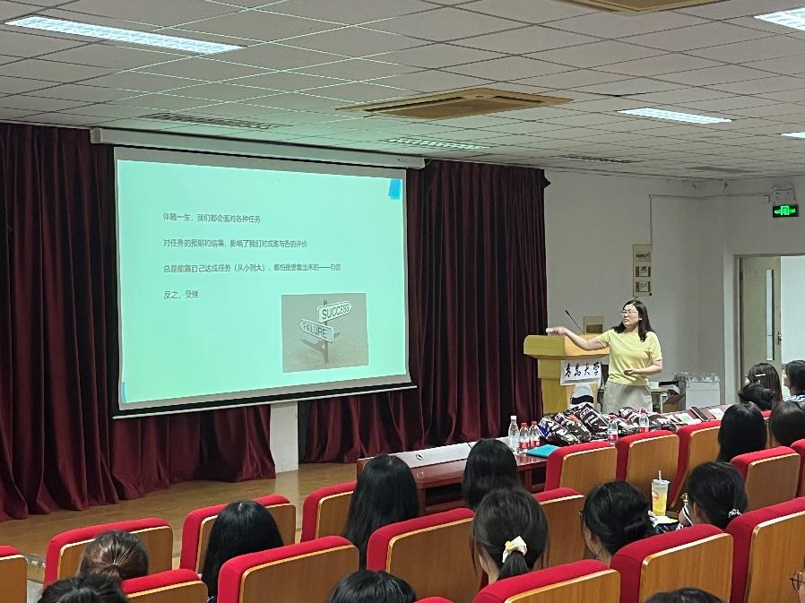 邀请心理健康教育与研究中心副主任周爱霞为新生做《新生活、心适应、新启航》主题讲座。