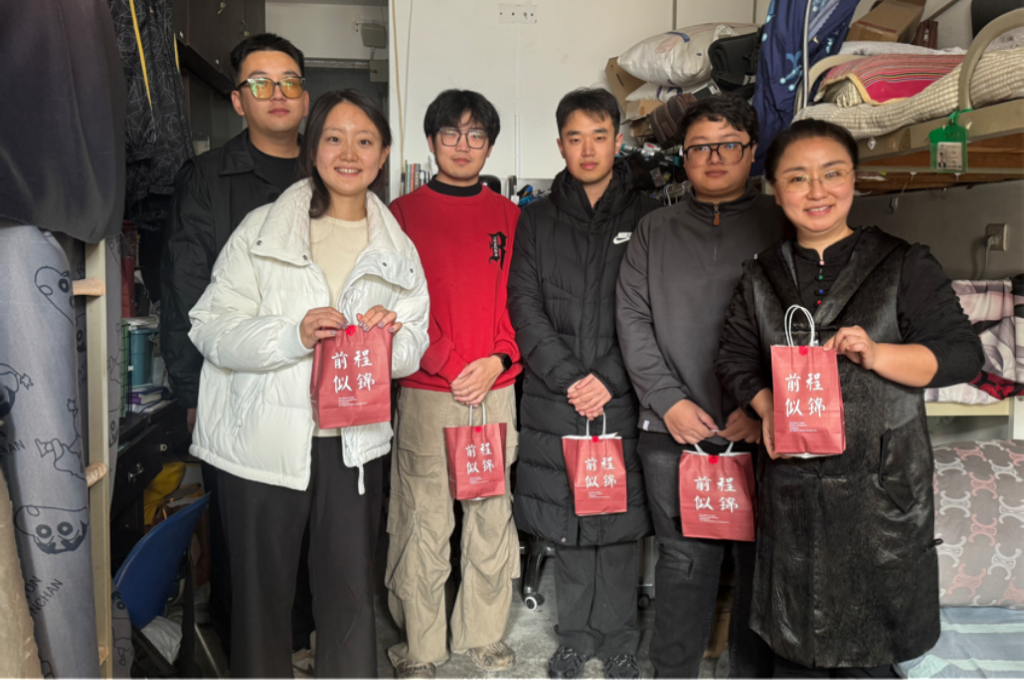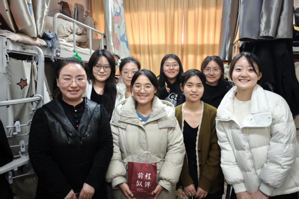 党委副书记徐伟、辅导员老师王嘉伟、商玉坤和学生会成员一起走进2021级毕业生宿舍,为全体2021级同学们送上入冬温暖福袋。