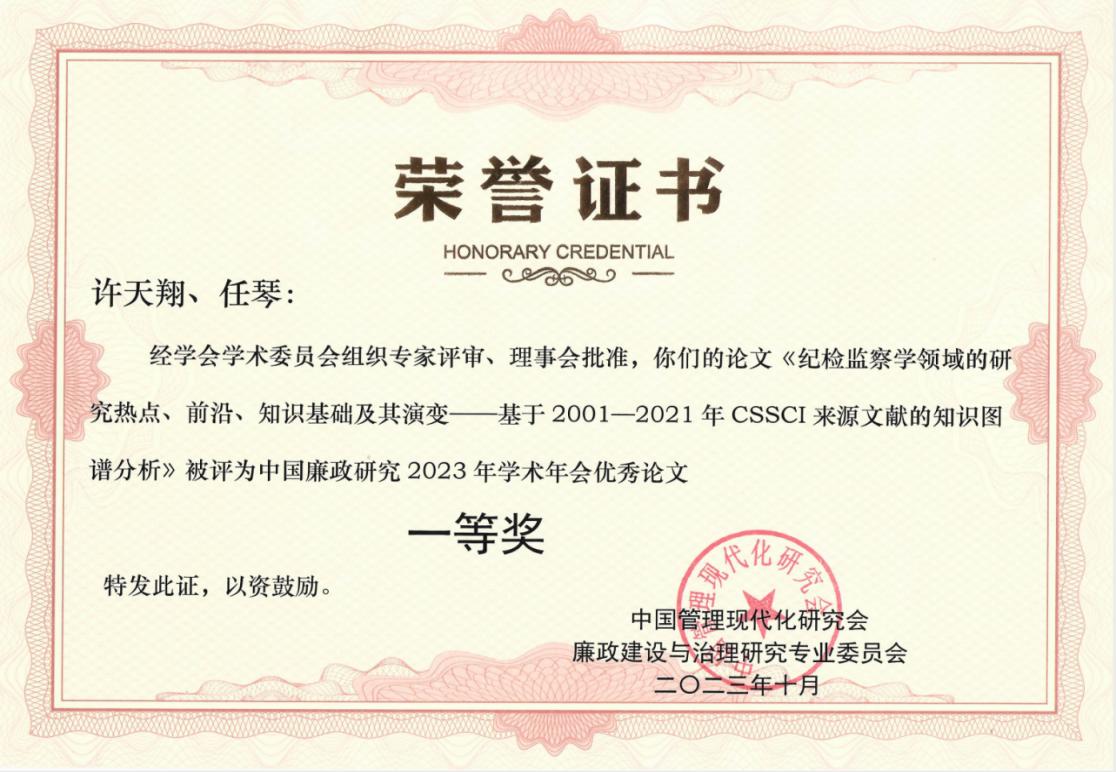 必赢(亚洲)唯一官方网站 共有3篇参会论文被收录,分别是《新时代乡村隐性腐败的发生机理及其治理策略》(陈洪连、蒋天昊);《联邦德国制度反腐的历史演进与现实结构研究》(陈平、贾浩林);《纪检监察学领域的研究热点前沿、知识基础及其演变——基于2001-2021年CSSCI来源文献的知识图谱分析》(任琴、许天翔),该论文被评为中国廉政研究2023年学术年会优秀论文一等奖。