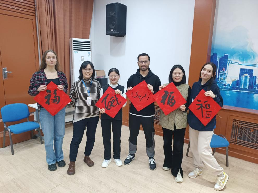 春节时,老师们还特意为我们举办了体验中国传统文化的活动,教我们写“福”字、拼宫灯,刚刚返回中国的我们和一直在中国生活的留学生朋友们欢聚一堂,一起拍照留念,别提多开心了,远在异国他乡,我也感受到了浓浓的中国年味。
