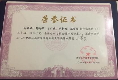 行政管理专业同学申报的《小区自治:社区冲突、集体行动与社会资本的积累》顺利通过了专家评审,成为31支获得初赛资格的团队之一;在实地调研阶段,团队成员在高红教授的带领下深入青岛市北区镇泰花园社区调研,对案例研究对象进行深度访谈,撰写完成了两万八千字的案例报告,成功入围决赛16强。为了在决赛中更好地展示此次案例成果,团队成员进行了精心充分的准备,并吸取了王猛博士与王青梅博士的中肯建议。决赛之夜,队长马婷婷在PPT展示环节不畏强手,从容自信,完成了团队的成果展示,同时,队员准备充分,出色完成专家答辩,最终整个团队凭借精彩的表现获得了清华大学评委老师的一致赞许。