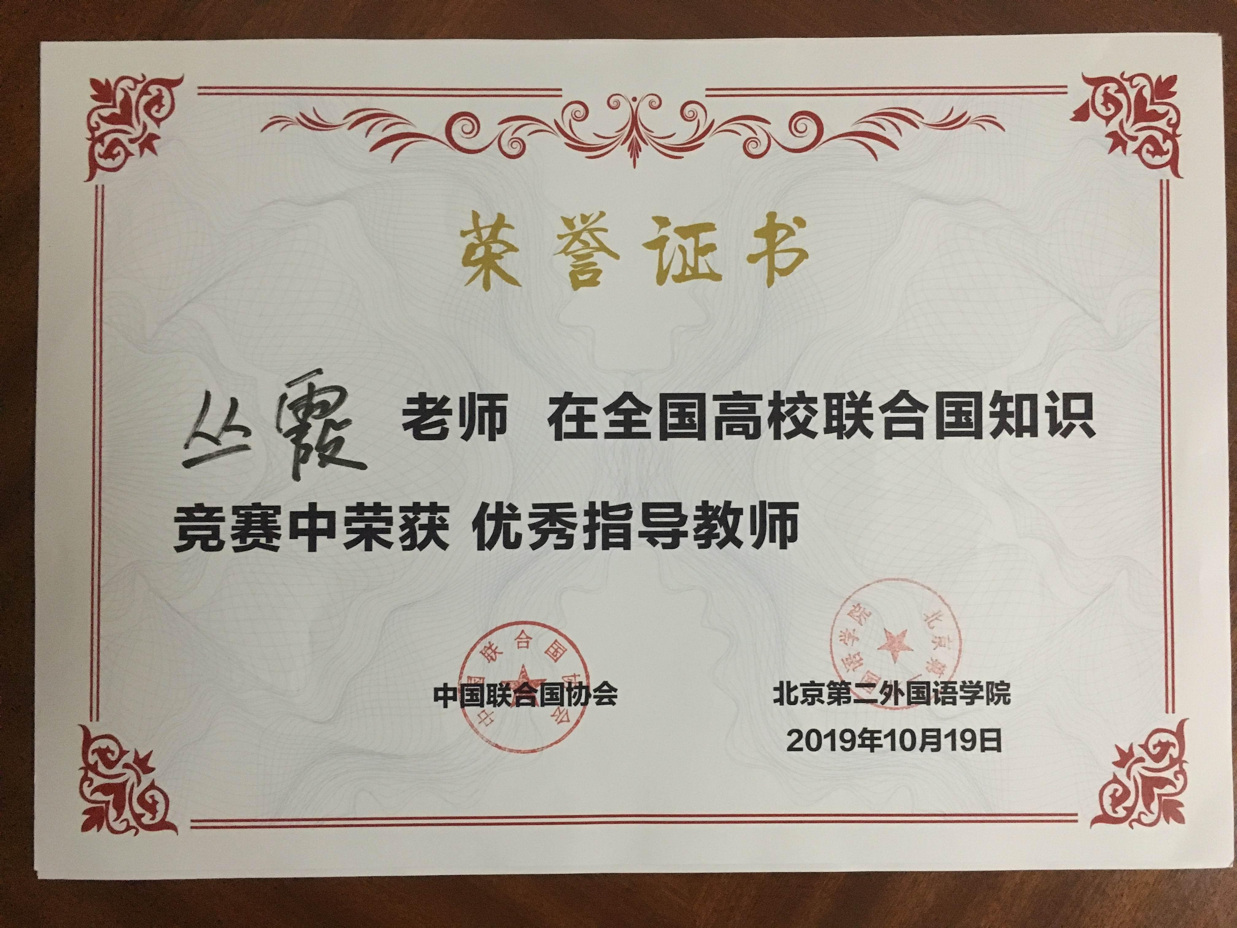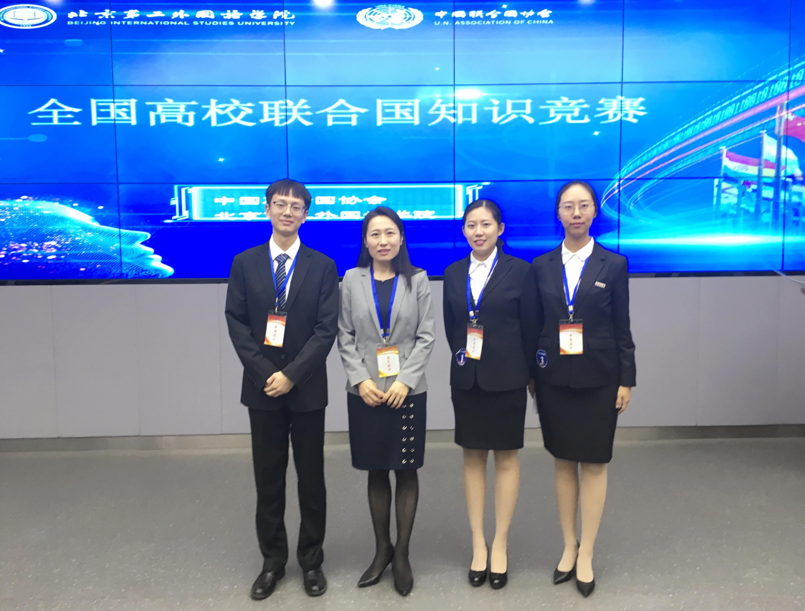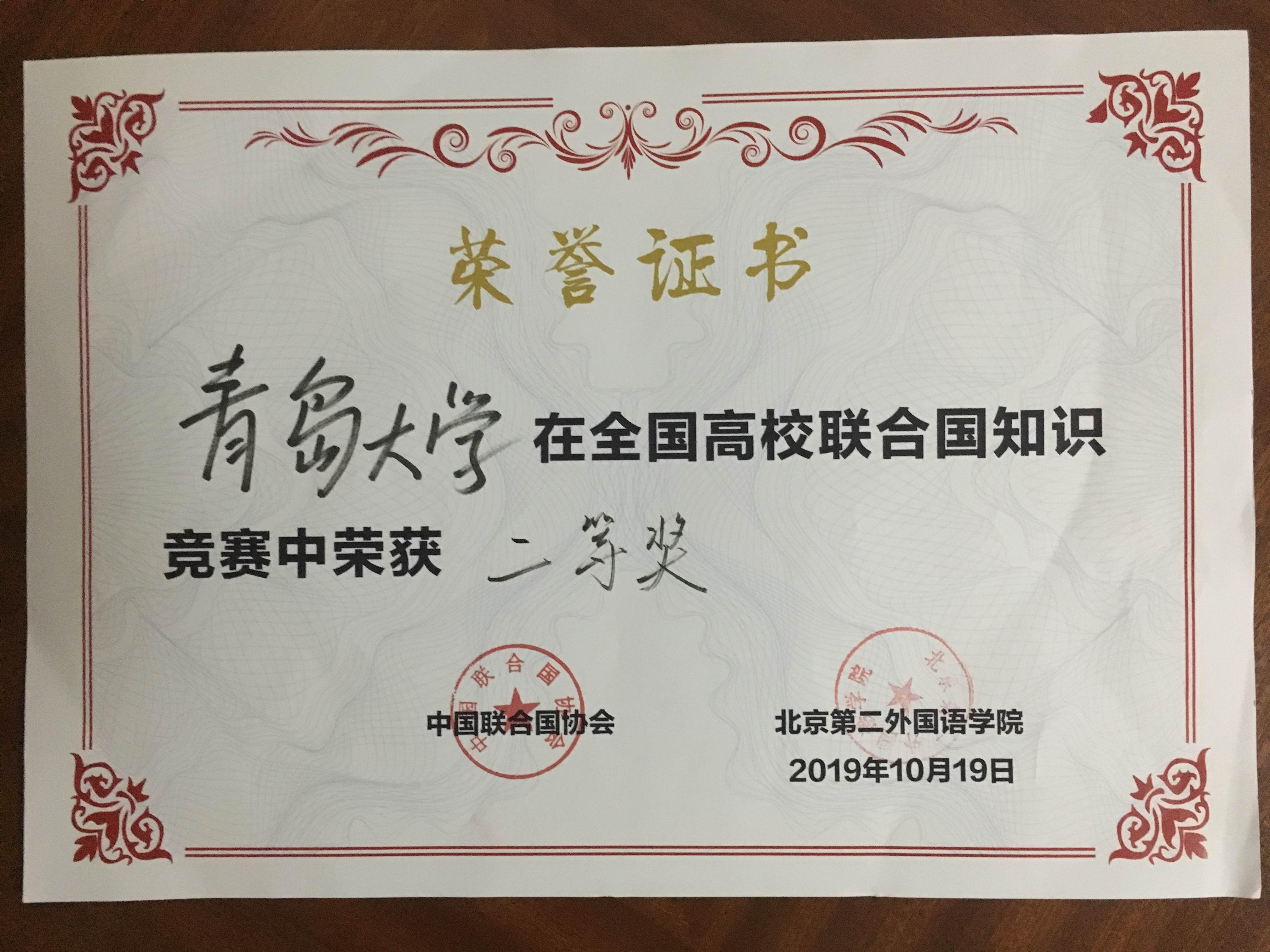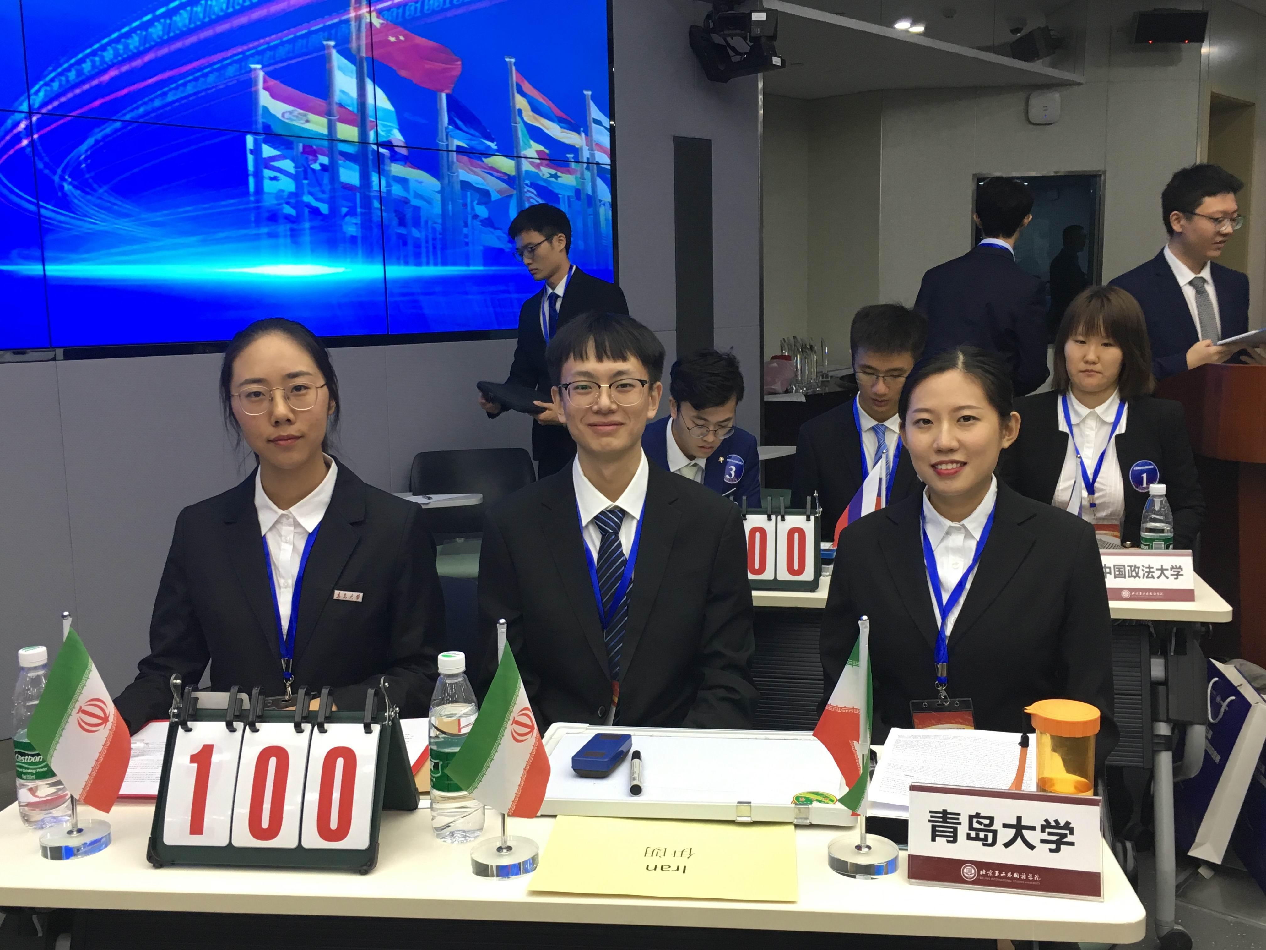 大学等国内二十一所高校参加了本次竞赛。我校派出了由丛霞老师带队,许晓艺、张锐、于小雨三位2017级国际政治专业同学组成的青岛大学代表队。经过数轮激烈角逐,我校代表队荣获集体二等奖,丛霞老师获得“优秀指导教师奖”,为学校争得了荣誉。