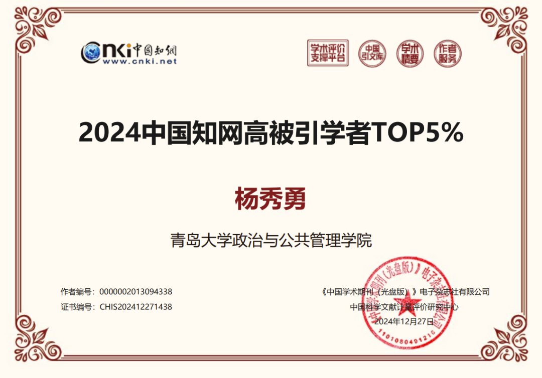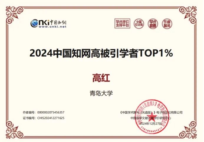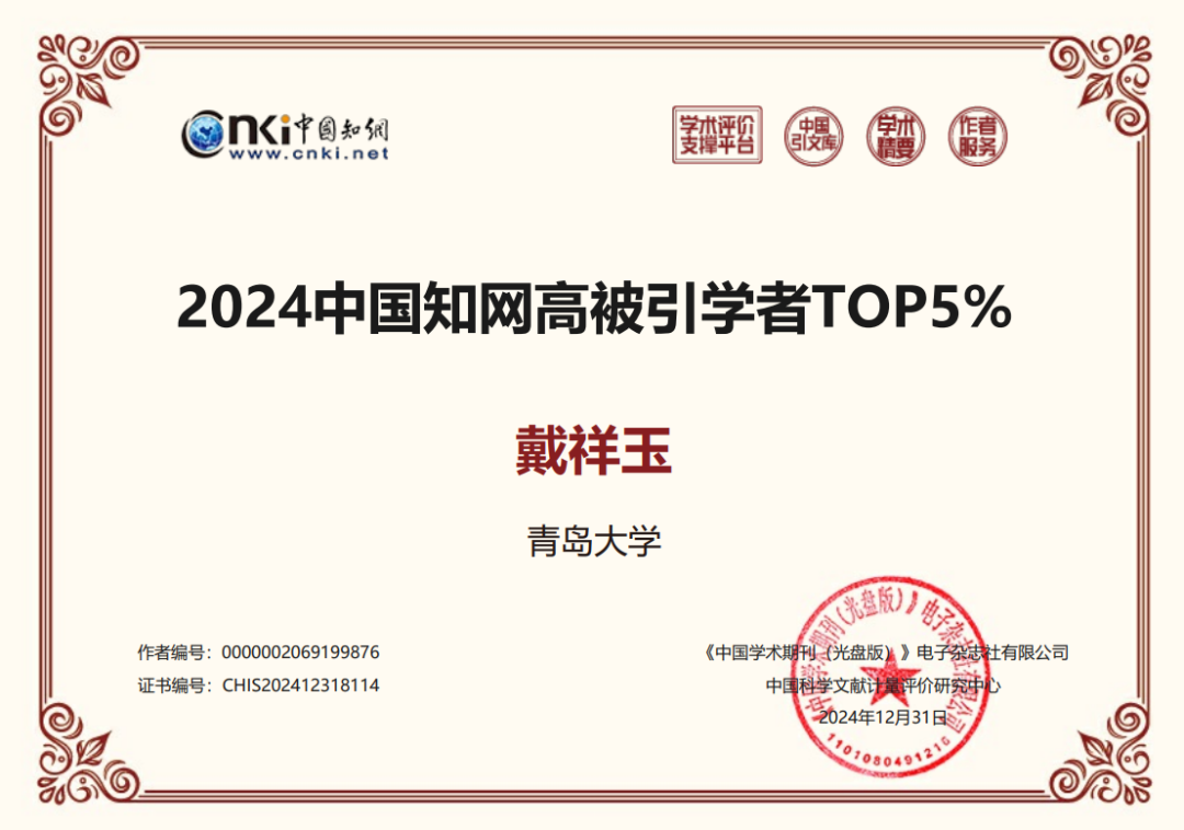 高红老师荣获2024年度知网高被引学者TOP1%的殊荣,同时,戴祥玉老师和杨秀勇老师也凭借卓越的学术影响力,入选2024年度知网高被引学者TOP5%,这一成就充分体现了必赢(亚洲)唯一官方网站
