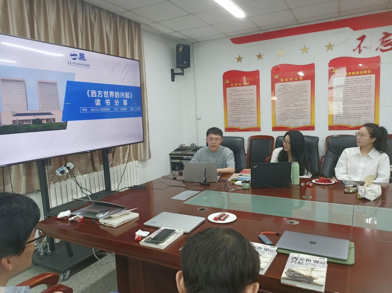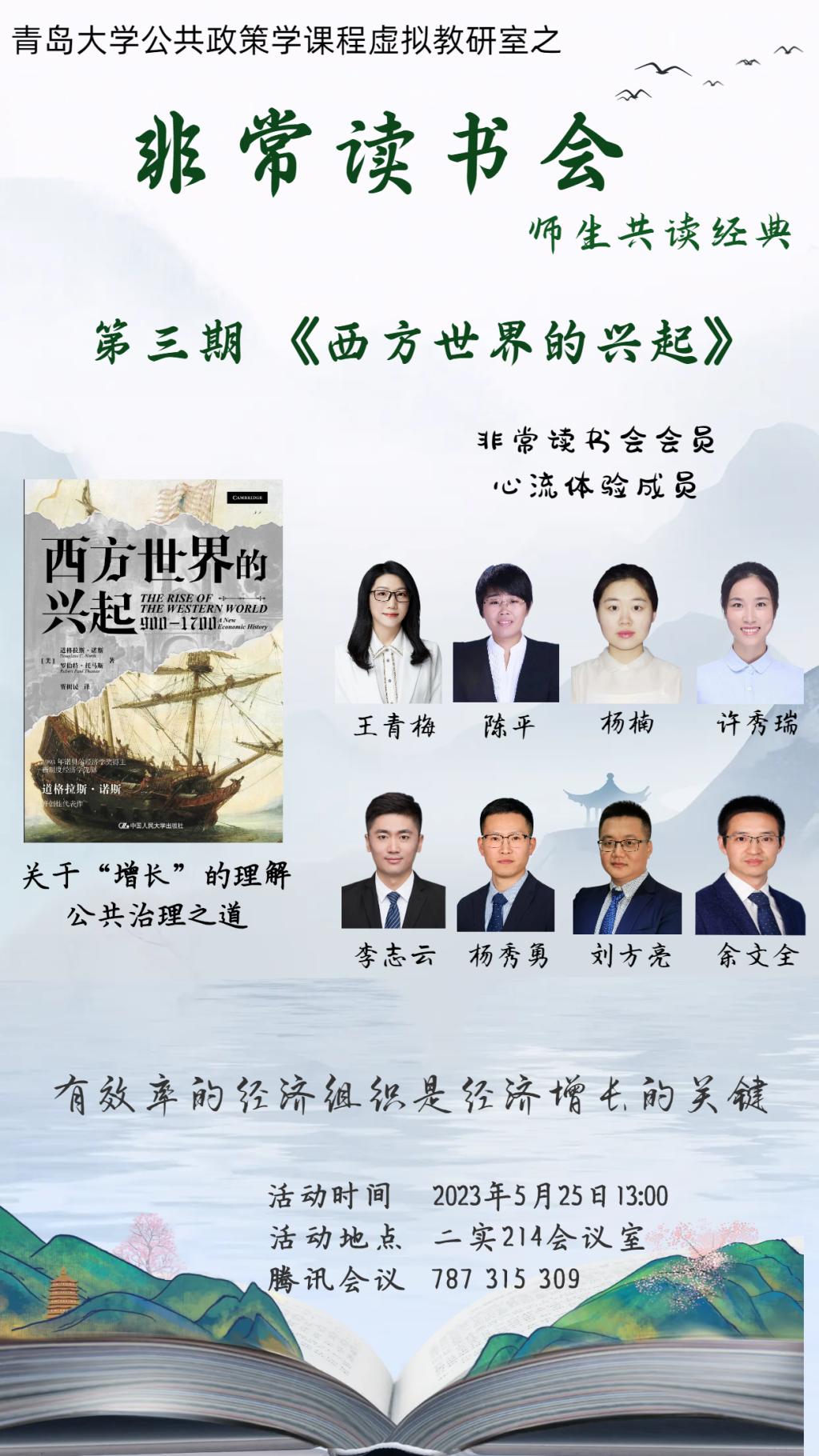 2023年5月25日下午,公共政策学课程虚拟教研室之“非常读书会”第三期活动在青岛大学金家岭校区二号实验楼顺利举办。本期共读书目为诺贝尔经济学奖经典著作《西方世界的兴起》。