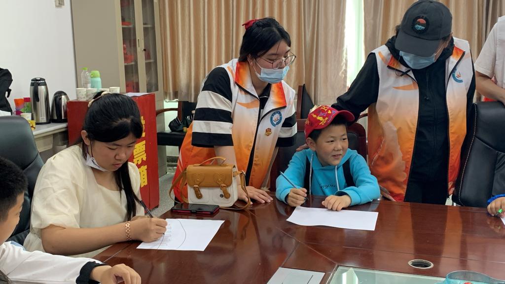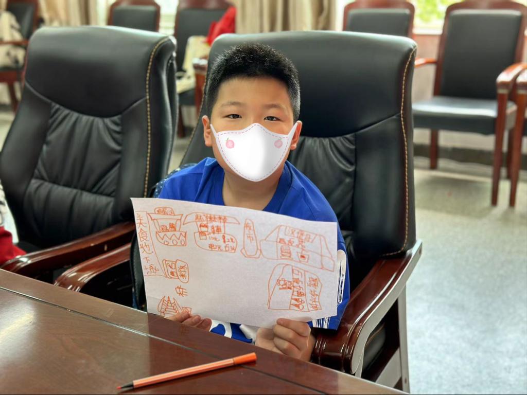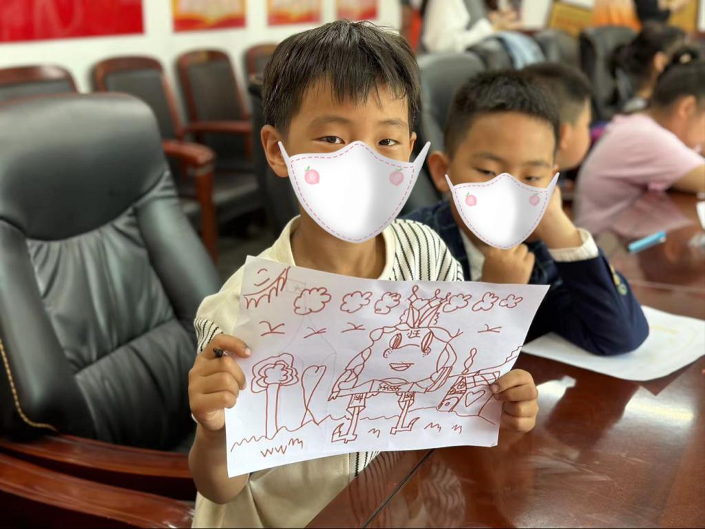 笔绘童心,提升本领。参观结束后,学生党支部成员为小朋友们讲解绘画技巧,使他们能够熟练运用各种色彩、线条进行构图。孩子们结合参观校园留下的“青大印象”,尝试用自己的创意和想象构思不同的图案和元素,用手中的画笔绘制“我眼中的青大”。