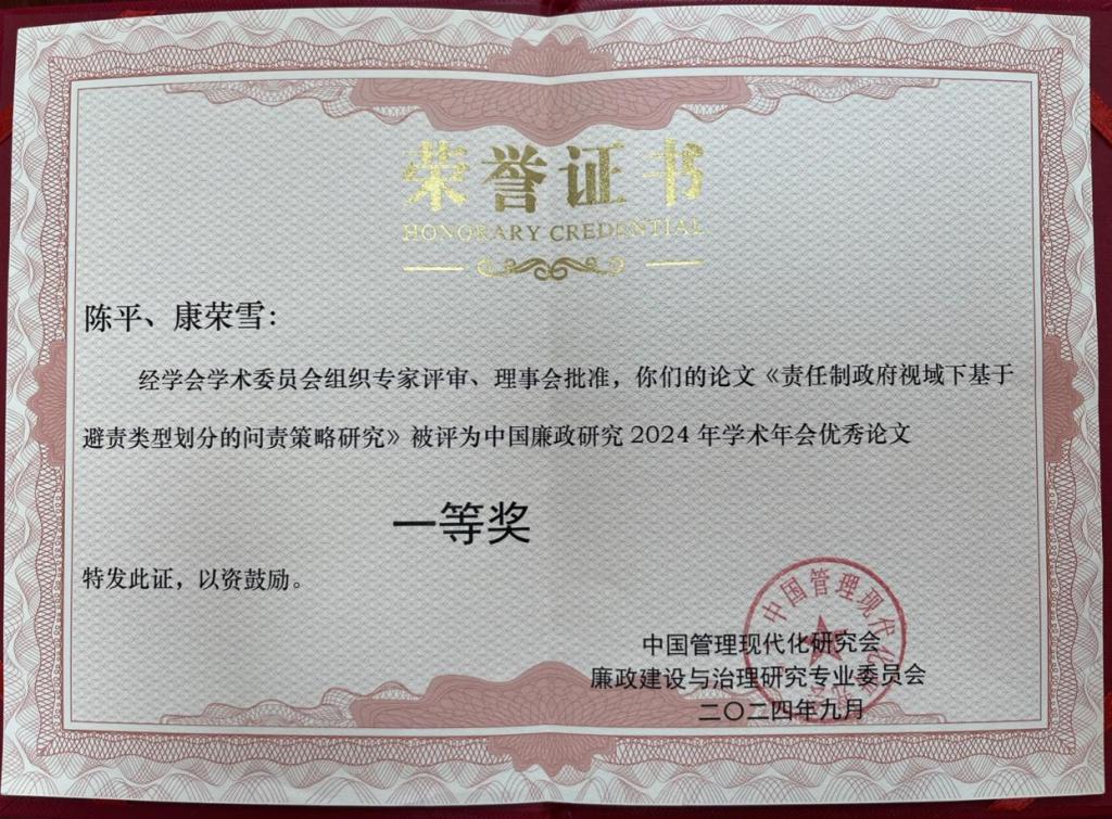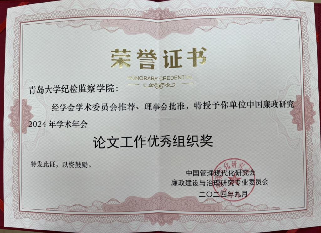 被授予中国廉政研究2024年学术会议论文工作优秀组织奖。